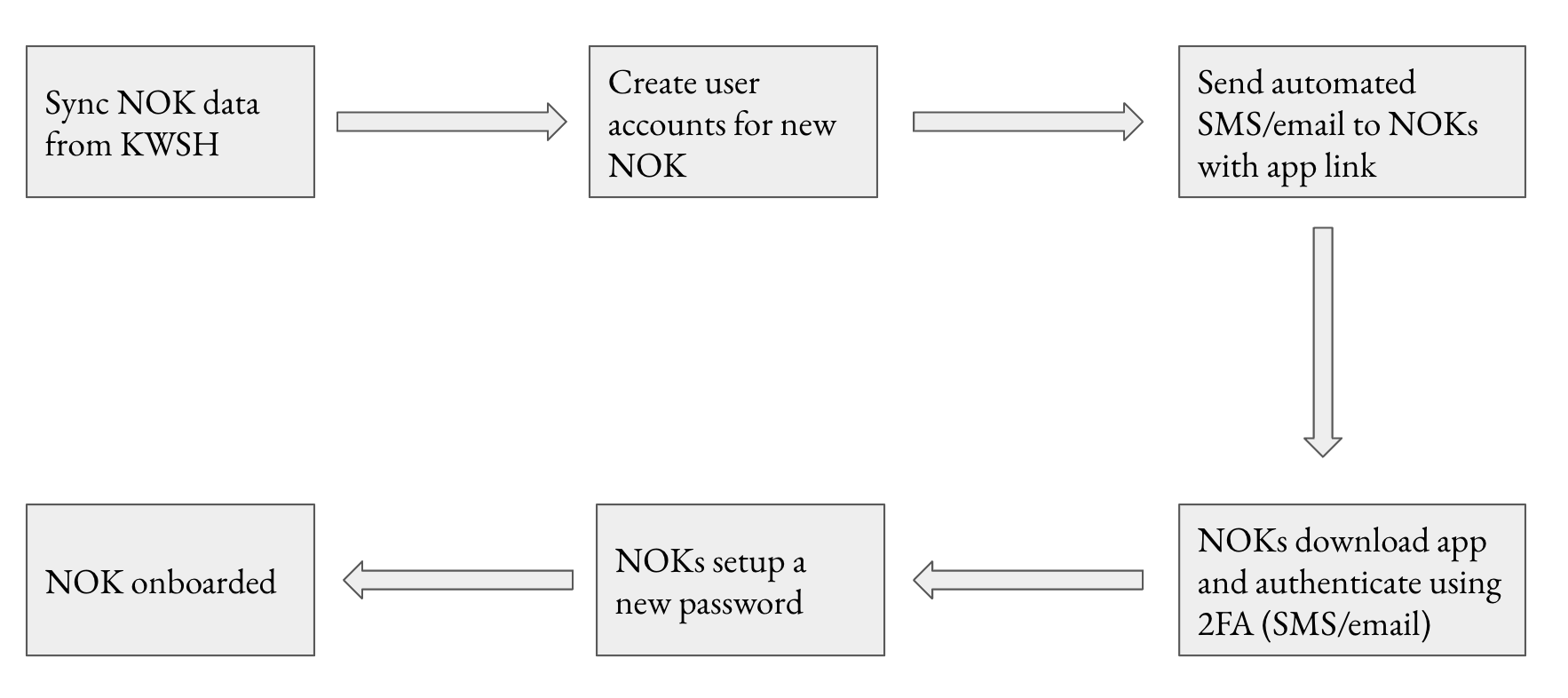 This project also presented a unique challenge: onboarding approximately 3,000 NOK — a significantly larger user base and a different demographic compared to our usual projects, which typically serve only an organisation’s internal staff. As such, we dedicated additional effort to designing an onboarding process tailored to this audience, ensuring that every NOK would know how to download and begin using the app.